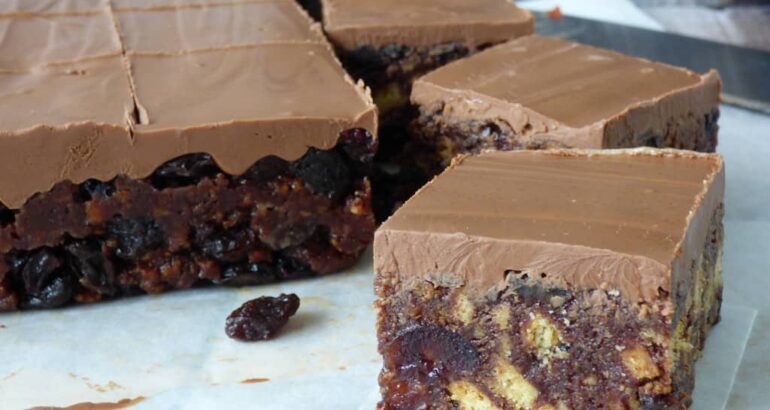 Ставете ја смесата на стреч фолија во форма на коцка и оставете ја во замрзнувач да се стегне. Потоа исечете ја и секое парче потопете го во стопено чоколадо од едната страна.