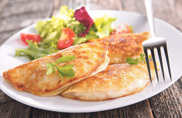 На секоја палачинка ставете лажица од смесата, преклопете ги двете страни кон средината, а потоа завиткајте. Палачинките извалкајте ги во брашно, потоа во јајце, па во презла и пржете на масло од сите страни додека не добие златножолта боја.