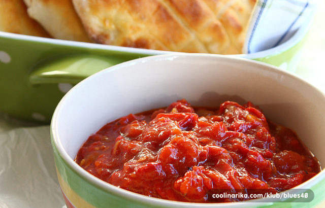 Испечете ги излупете пиперките, а потоа отстранете им ги дршките и семките. Доматот изрендајте го и варете го на тивок оган со маслото, оцетот, шеќерот и солта, додека смесата не се намали двојно.
