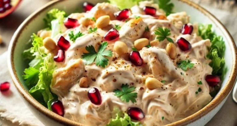 Во поголем сад ставете го пилешкото, кикириките, исчистената калинка, пченката, солта, павлаката и мајонезот.